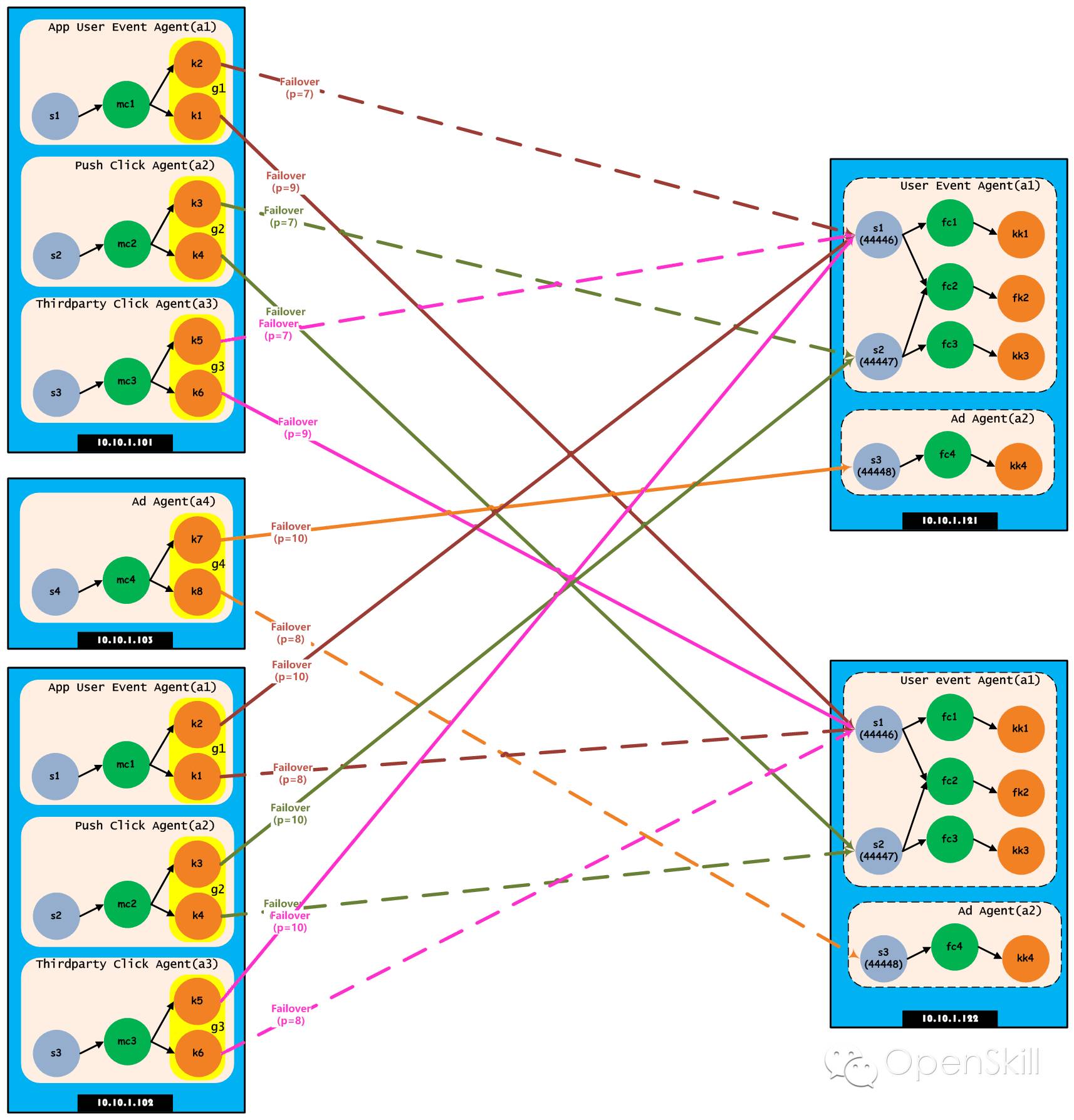 广告点击事件日志收集配置,如下所示: a4.sources = s4 a4.channels = mc4 a4.sinks = k7 k8 # Configure source a4.sources.s4.channels = mc4 a4.sources.s4.type = exec a4.sources.s4.command = tail -F /data/nginx/logs/ad.log # Configure channel a4.channels.mc4.type = memory a4.channels.mc4.transactionCapacity = 50000 a4.channels.mc4.capacity = 100000 # Configure sinks a4.sinks.k7.channel = mc4 a4.sinks.k7.type = avro a4.sinks.k7.hostname = 10.10.1.121 a4.sinks.k7.port = 44448 a4.sinks.k8.channel = mc4 a4.sinks.k8.type = avro a4.sinks.k8.hostname = 10.10.1.122 a4.sinks.k8.port = 44448 # Configure failover a4.sinkgroups = g4 a4.sinkgroups.g4.sinks = k7 k8 a4.sinkgroups.g4.processor.type = failover a4.sinkgroups.g4.processor.priority.k7 = 10 a4.sinkgroups.g4.processor.priority.k8 = 8 a4.sinkgroups.g4.processor.maxpenalty = 10000