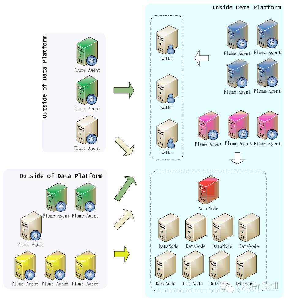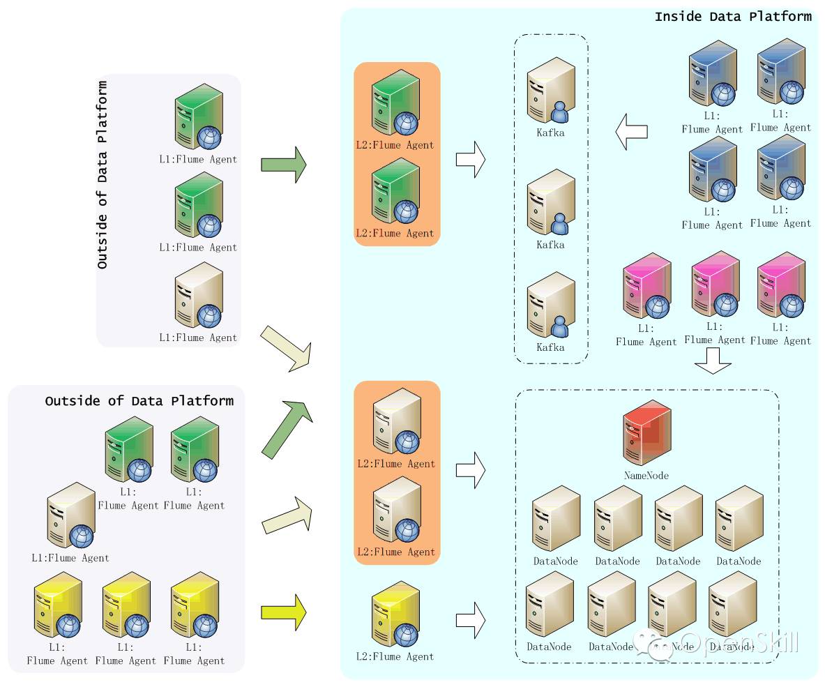通过上面分析可见,分层无非是为了使的日志数据源节点的Flume Agent服务与数据平台的存储系统(Kafka/HDFS)进行解耦,同时能够更好地对同类型业务多节点的日志流进行一个聚合操作,并分离开独立管理。另外,可以根据实际业务需要,适当增加Flume系统分层,满足日志流数据的汇聚需要。